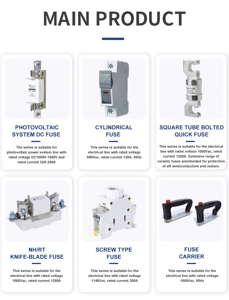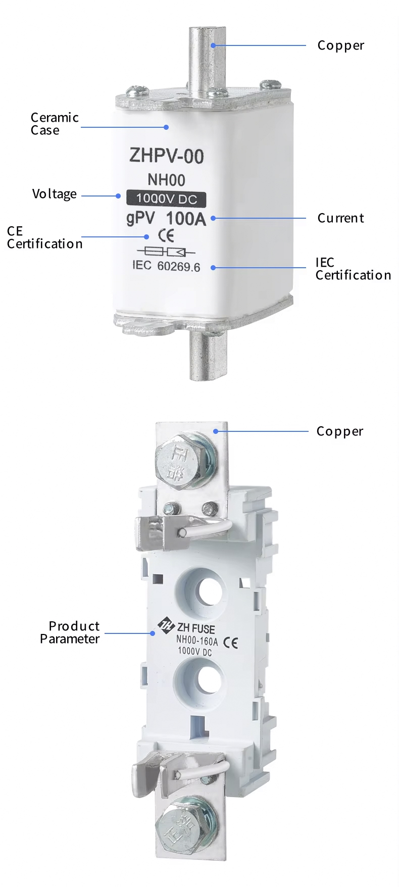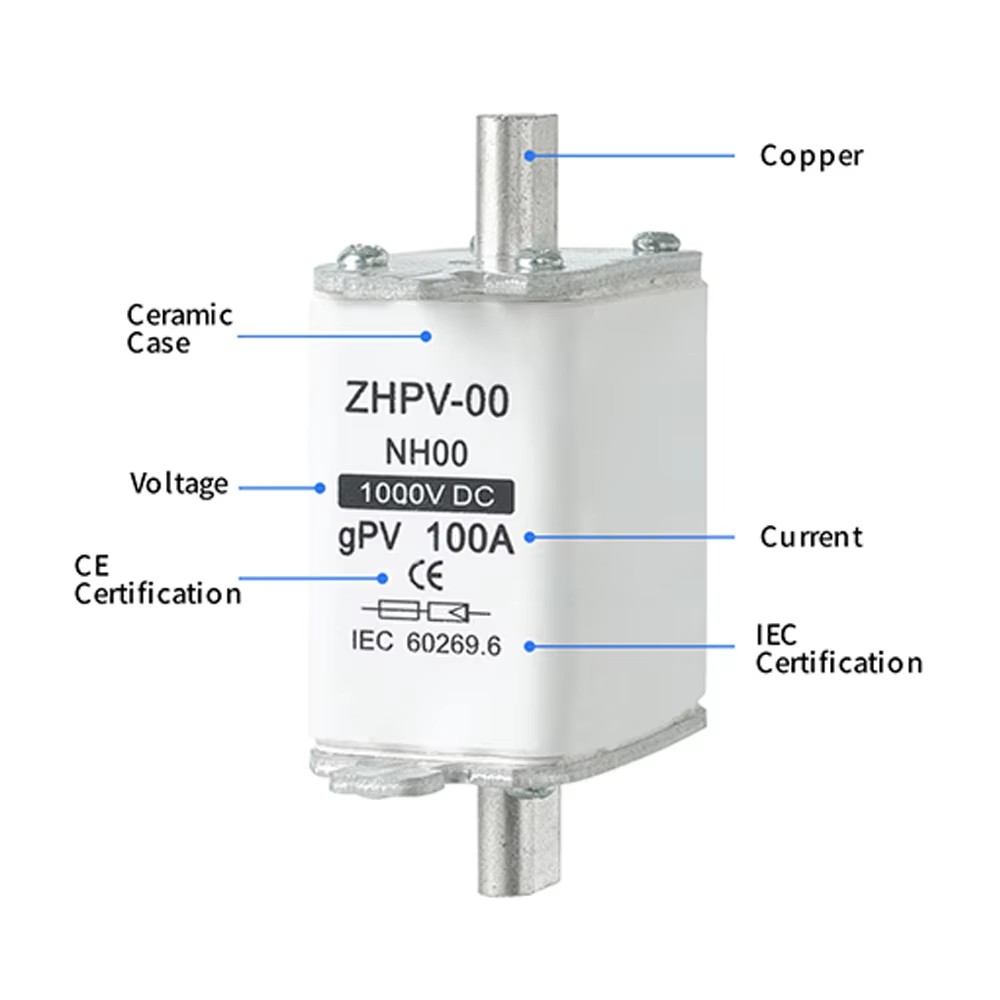 NH00 태양광 발전 시스템 DC 1000V 32~100A 퓨즈 링크는 태양광 DC 시스템의 과전류 보호에 적합합니다. 본 제품은 최대 전압 1000V DC, 전류 범위 32~100A를 지원합니다. 태양광 발전소 및 에너지 저장 시스템용으로 특별히 설계되었으며 과부하 또는 단락으로 인한 장비 손상을 효과적으로 방지할 수 있습니다.
