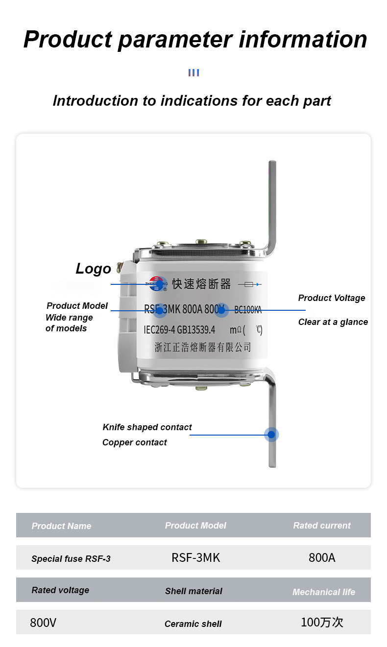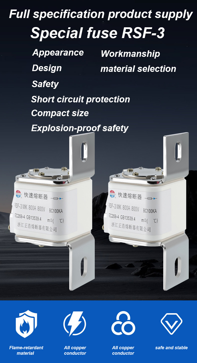 정격 전압은 500V, 정격 전류는 315A로 전기 안전을 효과적으로 보장하고 과부하 및 단락을 방지할 수 있습니다. RSF-3MK 800V-800A BC100KA 퓨즈 링크