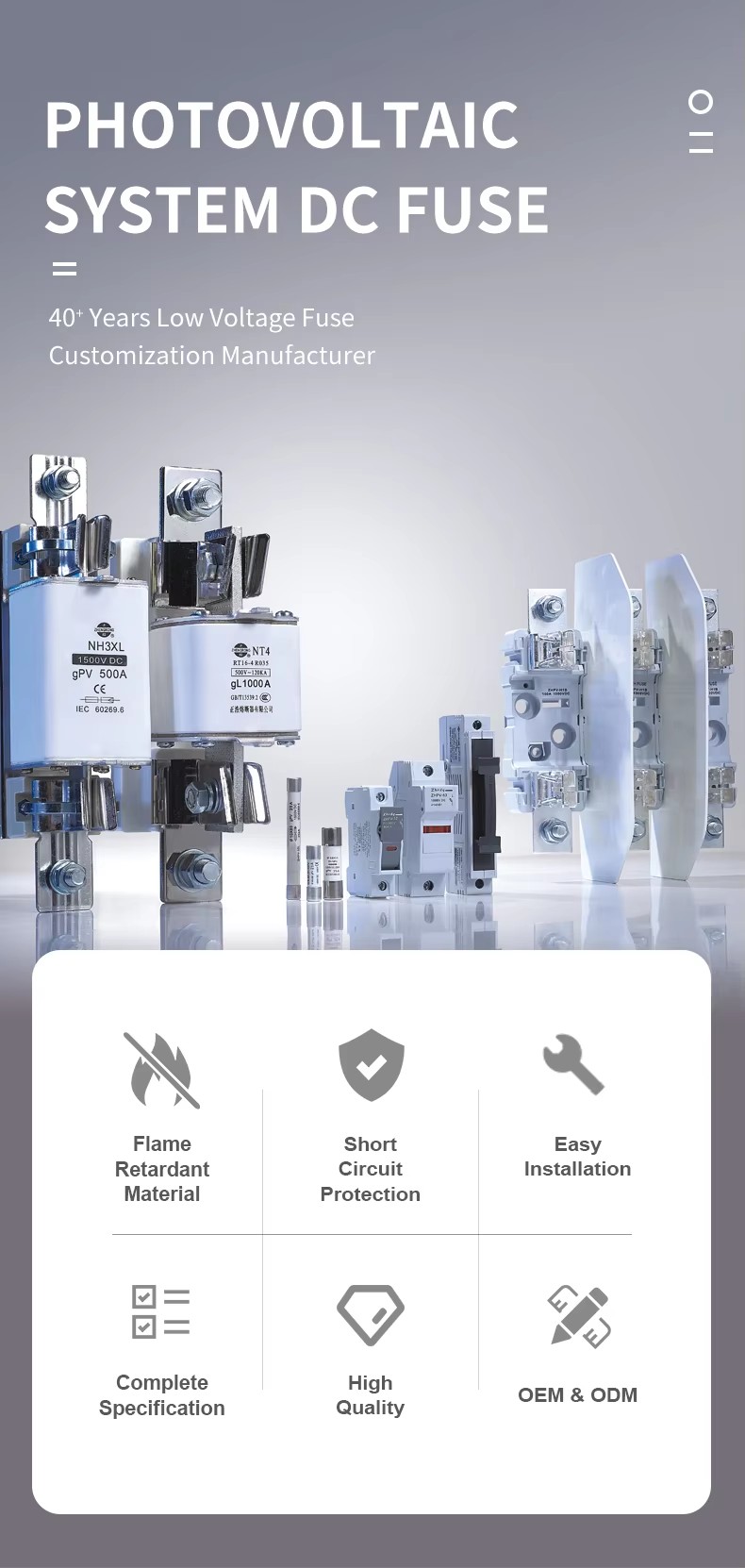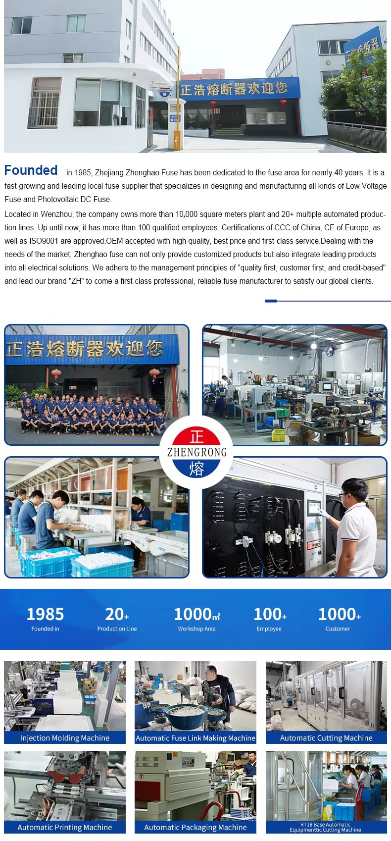 ZHPV-125 1000V DC 퓨즈베이스 및 퓨즈 링크의 구조적 특성 22 × 58mm 원통형 세라믹 퓨즈 바닥은 다음과 같습니다. 이 일련의 퓨즈는 퓨즈 링크와 퓨즈 홀더로 구성됩니다. 순수한 구리 시트 (또는 구리 와이어, 은색, 은색 시트)로 만든 가변 단면 퓨즈 본체는 고 강성 세라믹 또는 에폭시 유리 천 튜브로 만들어진 퓨즈 튜브에 밀봉되며 화학적으로 처리 된 고급 쿼츠 모래로 채워진 아크 소화 매체로서. 퓨즈 코어의 양면은 스팟 용접을 통해 엔드 플레이트에 안정적으로 연결되어 원통형 캡 모양 구조를 형성합니다. ZHPV-125 1000V DC 퓨즈베이스는 적절한 크기 퓨즈 바디 구성 요소에 대한지지로 리벳 팅에 의해 연결되는 퓨즈 요소를 포함하여 전기 충격으로 압축 된 수지 또는 플라스틱 쉘로 만들어집니다. 이 일련의 퓨즈는 소량, 쉬운 설치, 안전한 사용 및 아름다운 외관의 장점이 있습니다.